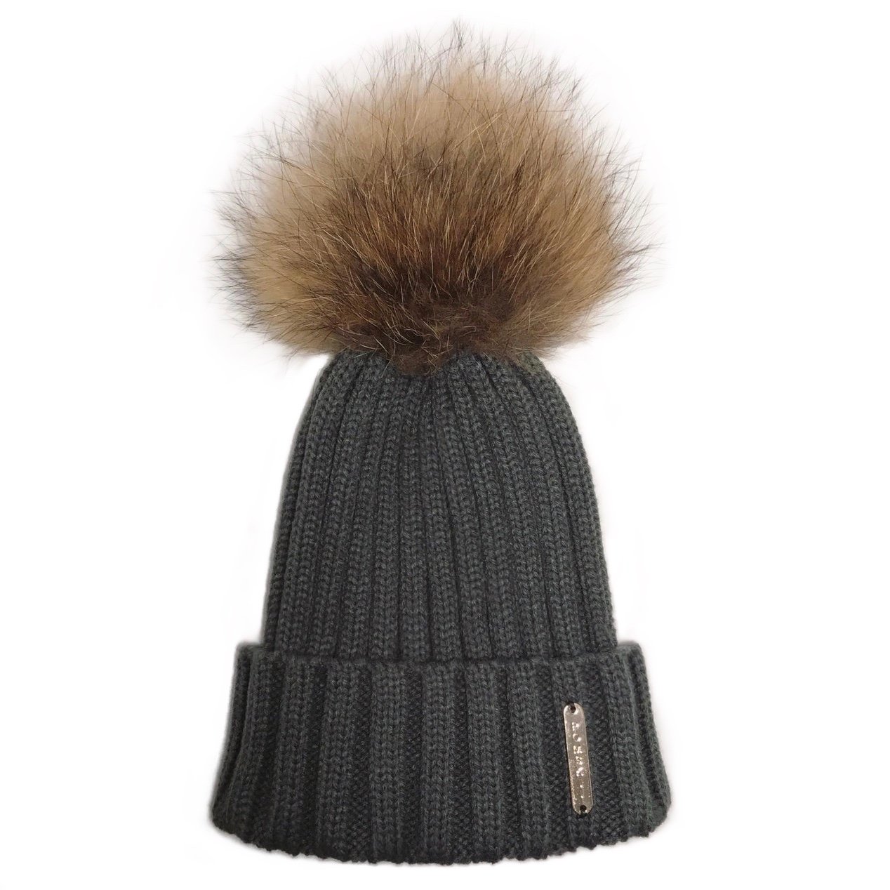 Luxury fur pom pom bobble hat in Ash Grey with natural brown Pom and gold metal logo.
