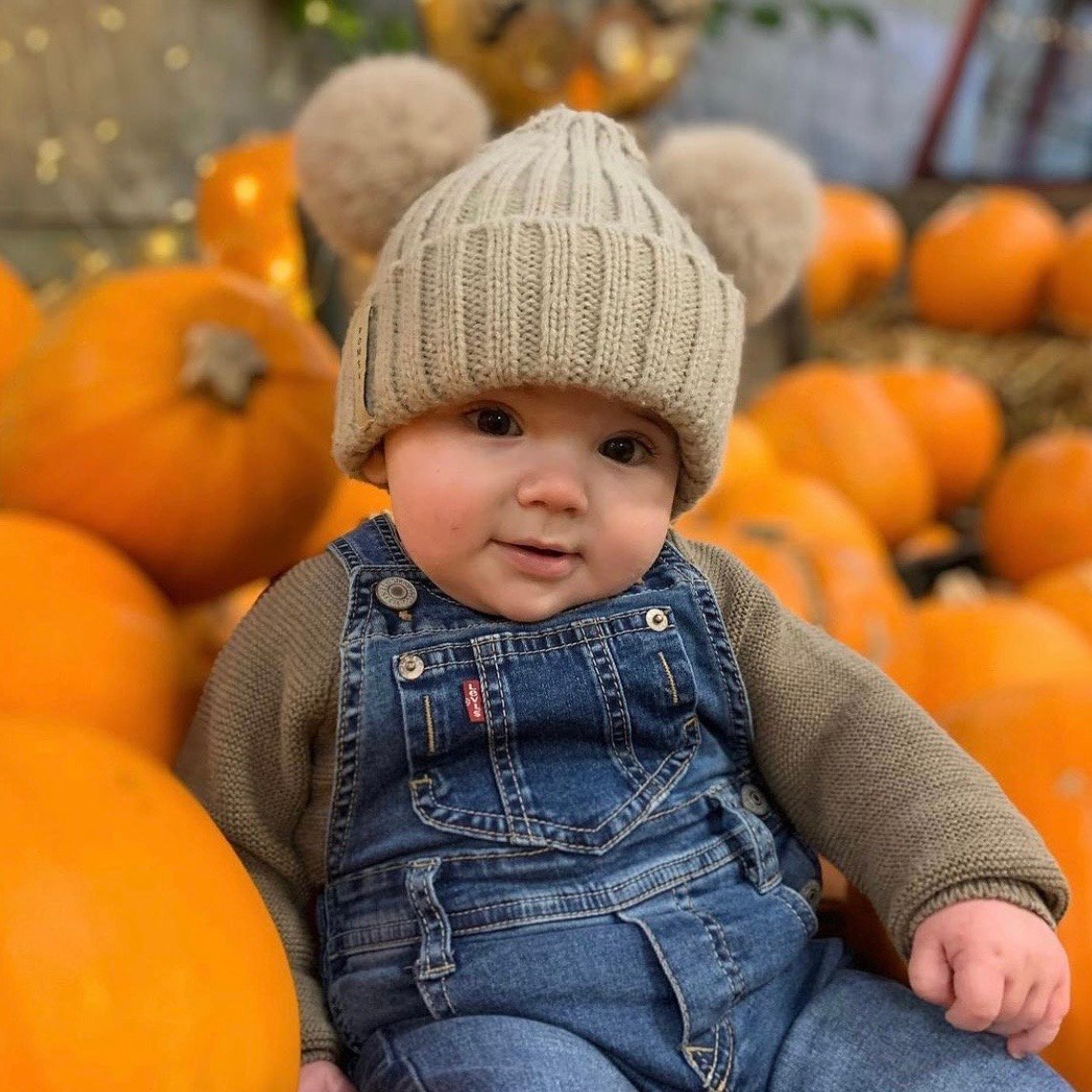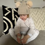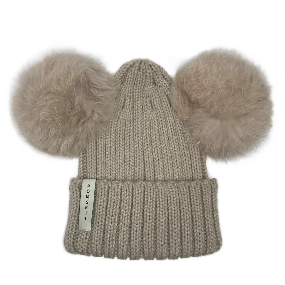 Baby luxury fur pom pom bobble hat in Beige with matching Pom ears.