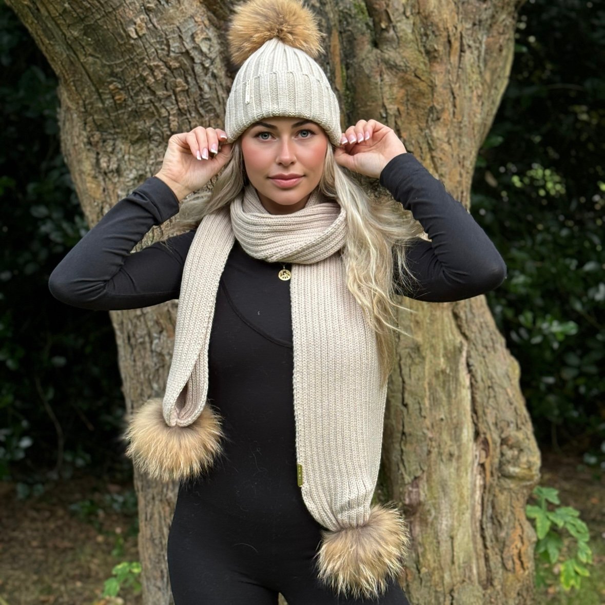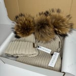 Luxury fur pom pom hat and scarf in Beige with natural brown Poms. This will come wrapped in a box making it a perfect present.