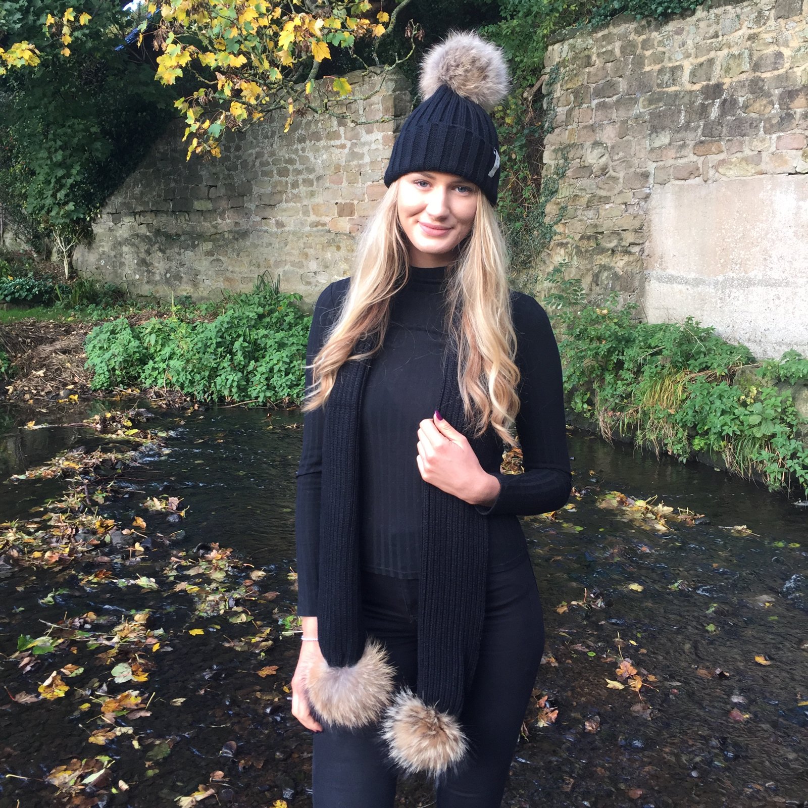 Luxury fur pom pom scarf in Black with natural brown Poms.