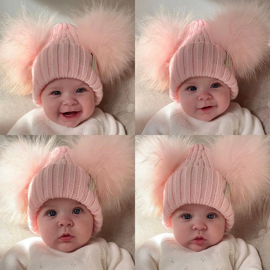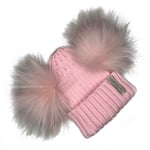 Baby luxury fur pom pom bobble hat in Candyfloss with matching Pink poms.