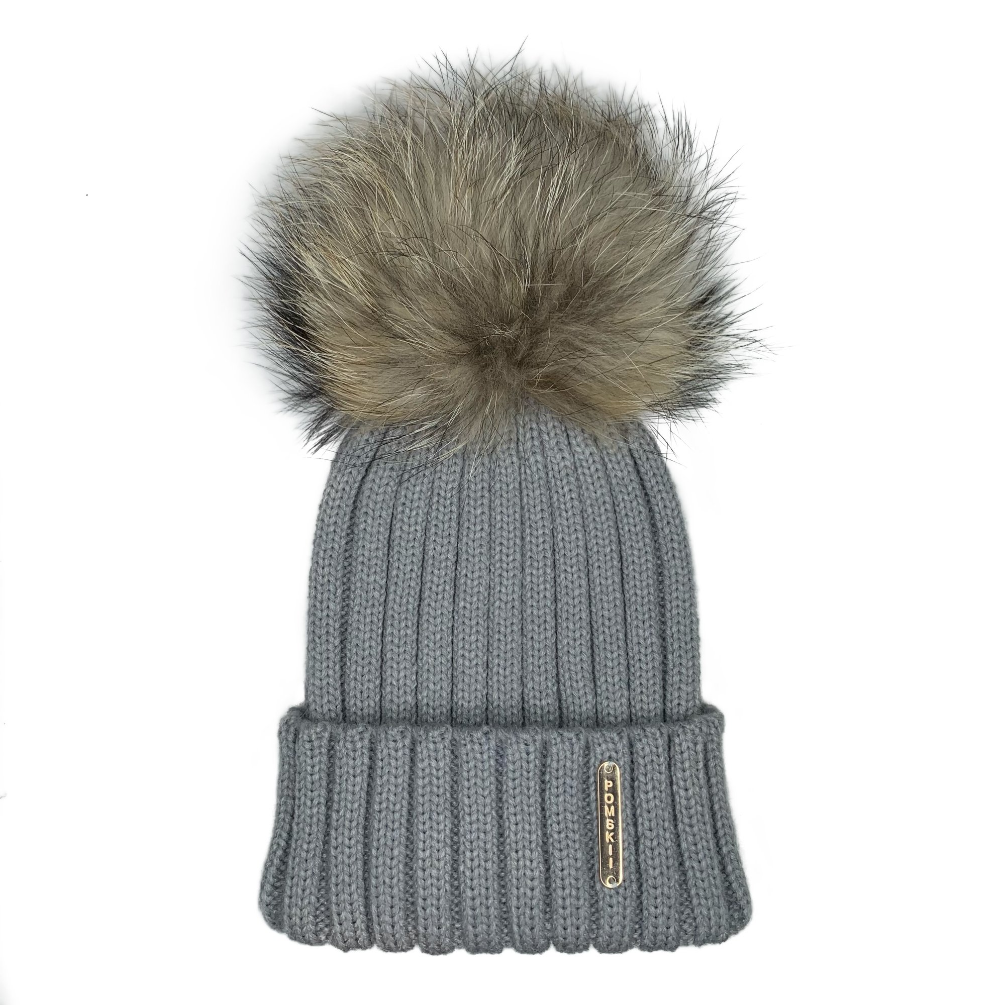 Luxury fur pom pom bobble hat in Pale Grey with natural brown Pom and gold metal logo.