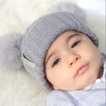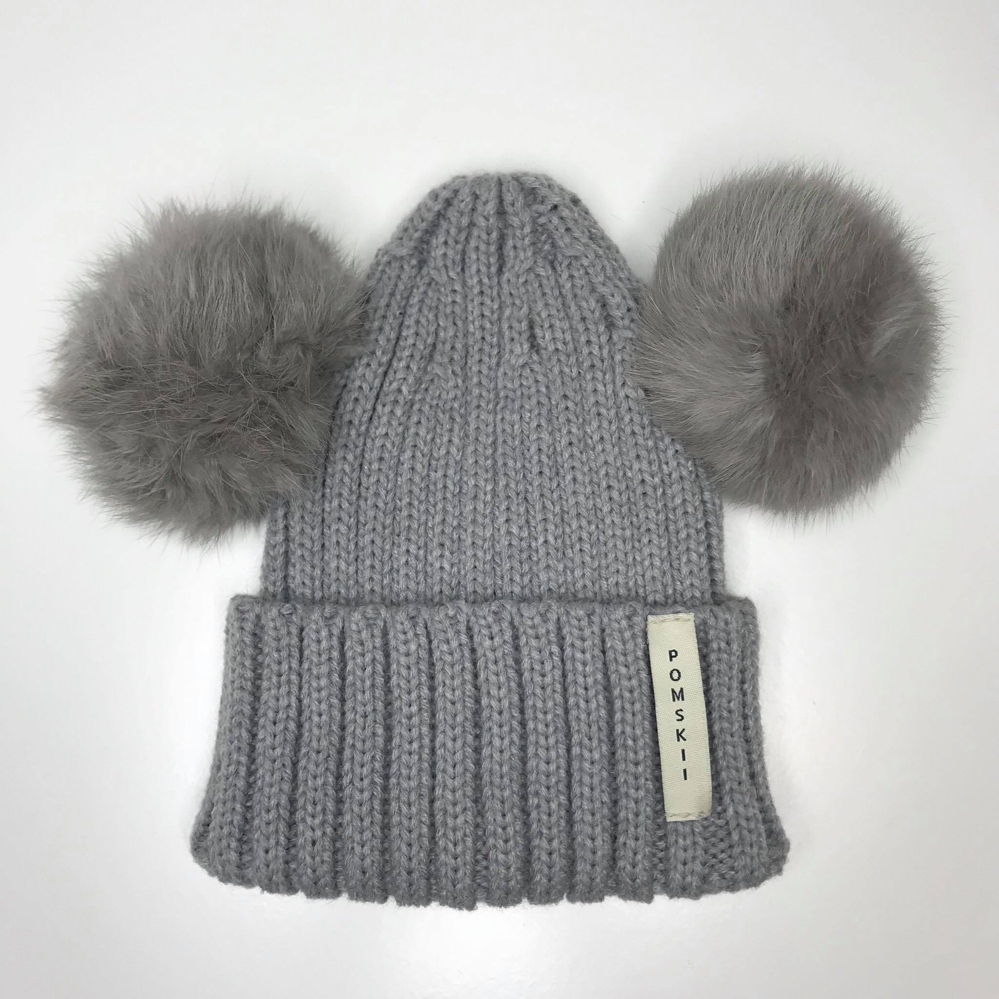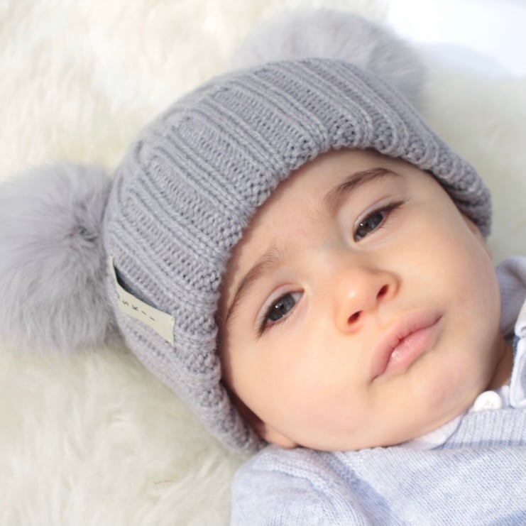 Baby luxury fur pom pom bobble hat in Pale Grey with matching Pom ears.