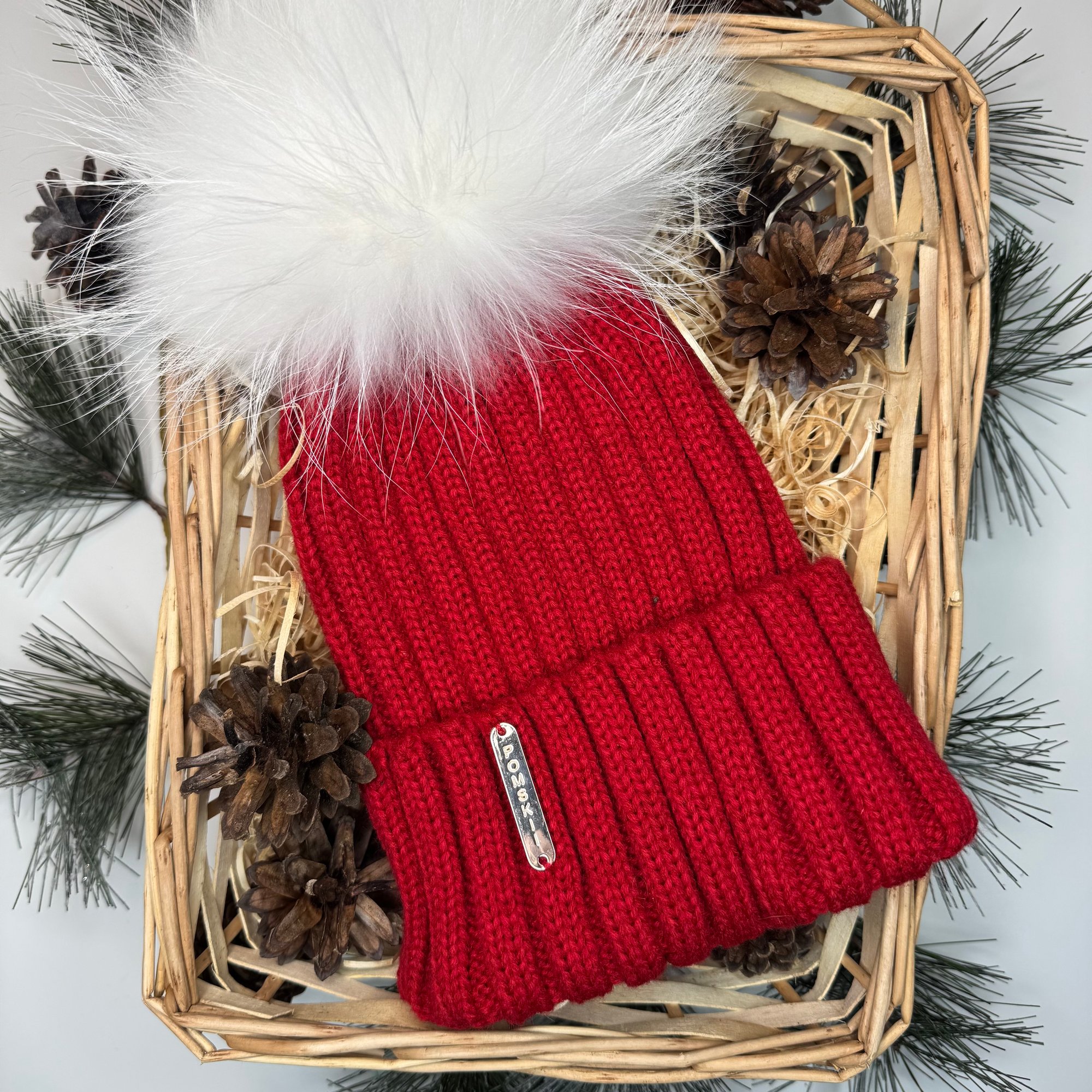 Limited edition luxury fur pom pom bobble hat in Berry Red with a White Pom.