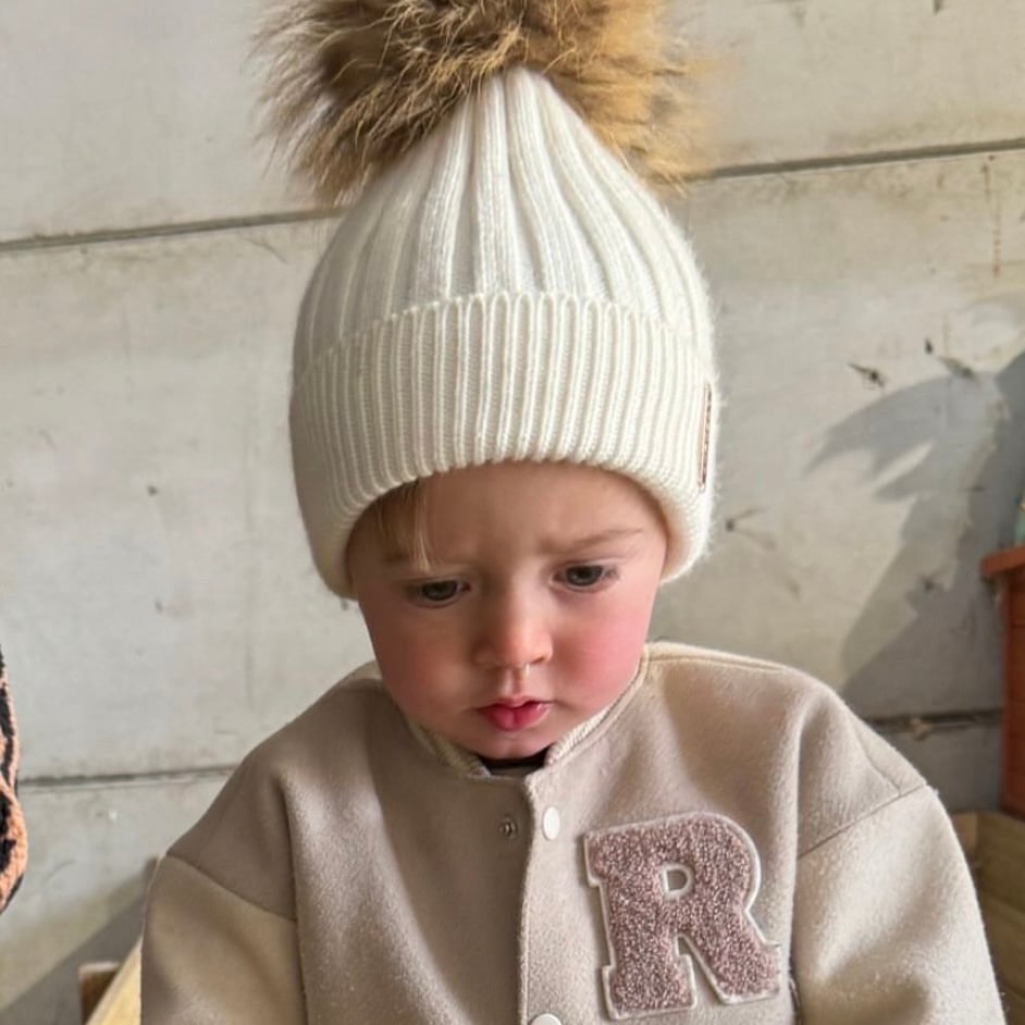 Baby Chunky Knit Angora pom pom bobble hat in Vanilla.